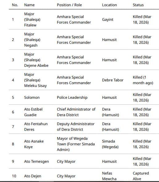 Reportedly, Fano fighters killed, captured and wounded around 500 government and security officials in Thursday’s attack. ENDF returned to the area after the deadly attack. But Fano fighters retreated before Ethiopian military’s entry into the area. Following security and administrative officials were killed by Fano in this incident: